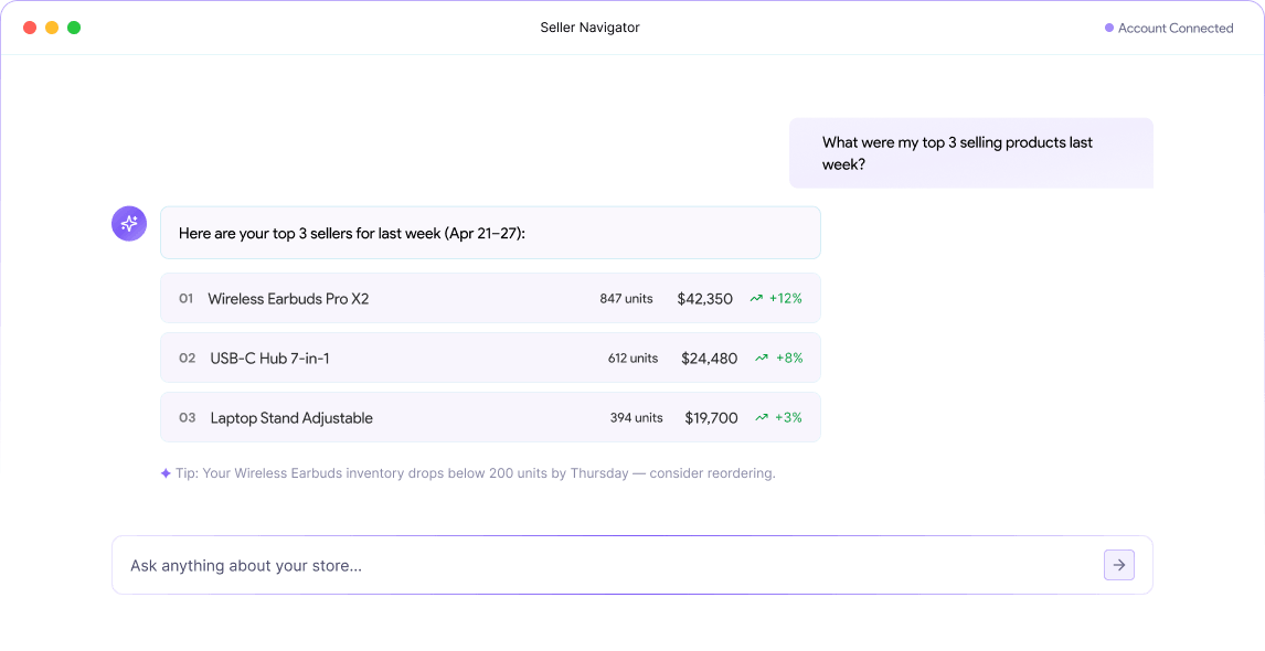 “Seller Navigator is a lifesaver for me. I run everything on my own, so there is no team to pull reports or make sense of the numbers; that's all on me. Now I just chat with Seller Navigator and get my business insights straight away.”